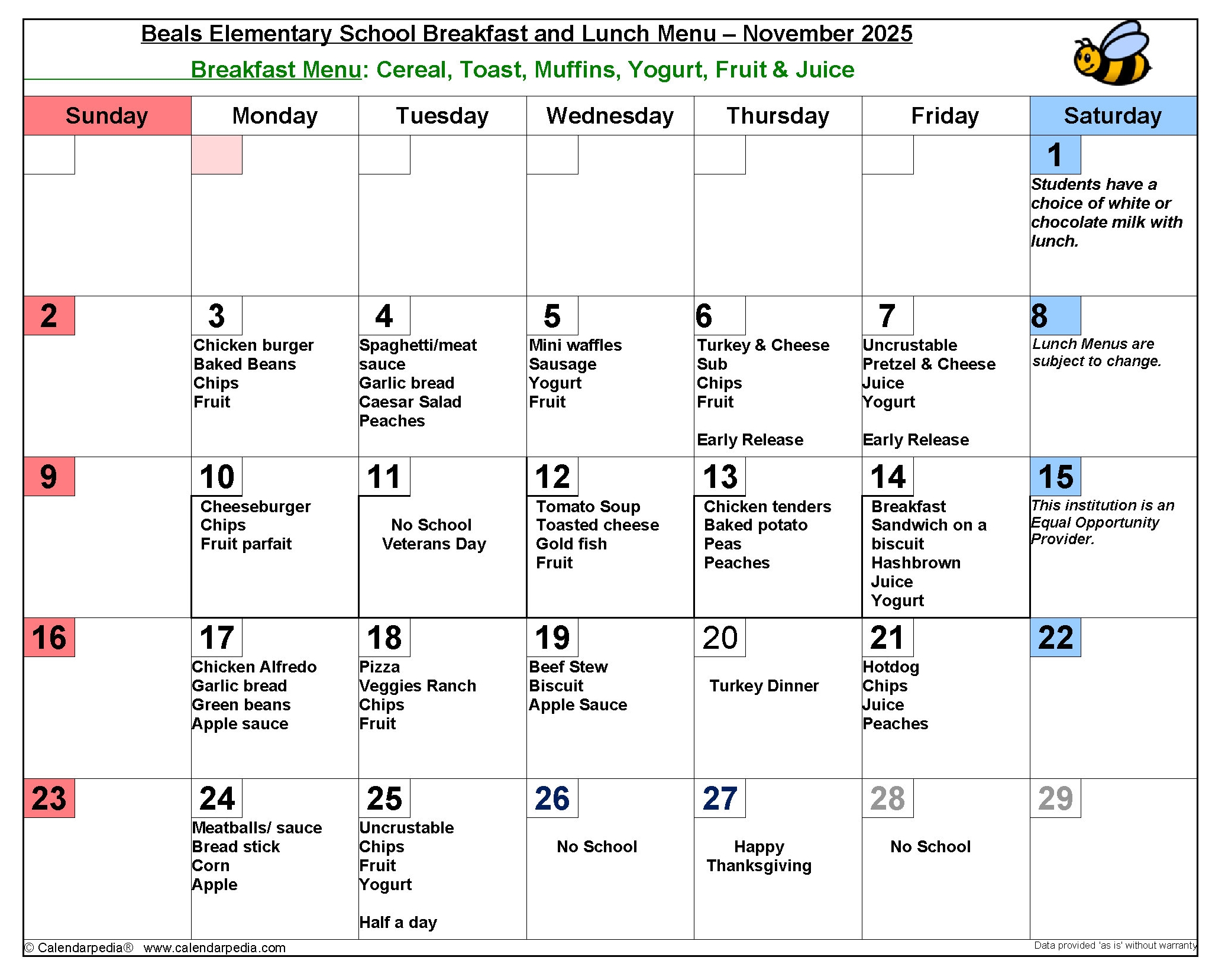 Beals Elementary School -Breakfast and Lunch Menus for November 2025